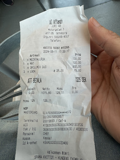 So was at this place with my co worker. Then grill that we ordered was 475 sek, we asked for a 2 person grill but wanted to add a 3th person so logically it would be minimum half of the price of 475 added not 900 sek was is 99 sek less than the family option. So over charged. The the minced meat I smelled it smelled off after it tasted funny. The lamb chops was burned, dry and then put on the burned side downwards. We ordered some starters and asked to get it at the same time. We got the warm starters first what is not correct if you do the right order. When we finished it they came with the cold sauces and some bread. The good thing was the tzatiki. The only 2 star was a funny interaction with a service guy. Rest was not good. As a chef myself for 25 years. It was way below par. Hope you guys have a good chat with the staff to prevent this from happening in the future.