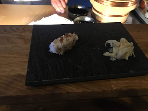 Apart from the extremely high quality, the guy also tries to innovate and to put his personal touch on every thing he serves. He gave us a taco with perch on a leaf of lettuce that was amazing. Also we got a seabass nigiri with some truffle salt on top that was mouth watering. By the end he serves some charred nigiris, like a charred langoustine with chili soy that I loved. Even the dessert, which was a homemade yuzu sorbet, was delightful.