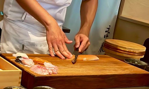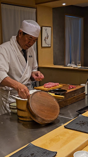 The place is very small. It can sit at most 14 guests or so. For the best possible experience you should sit at the bar. The chef is a very nice guy. You can tell that sushi is his passion by how he talks about it, and how carefully he cuts the fish and assembles your meal. He is helped by his father and a waitress, so it is basically a small family-run business. However, they are superb craftsmen so the experience is more polished than what you get in many fancy restaurants out there.