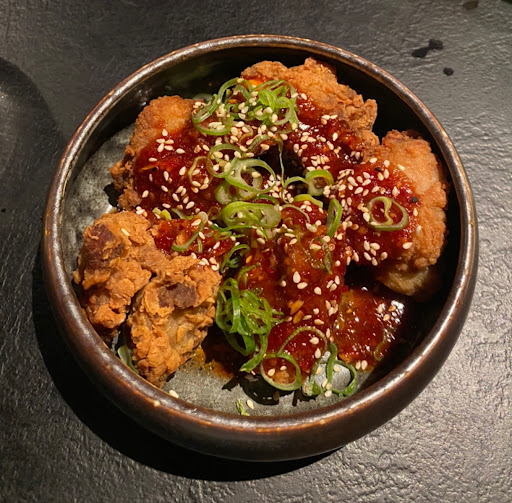 Korean fried chicken sweet and a bit spicy. Crunchy outer layer despite having sauce on it, soft and juicy chicken. With this comes 3 side dishes and rice. I’d definitely say you get more then you pay for. I enjoyed it a lot and would definitely recommend it.