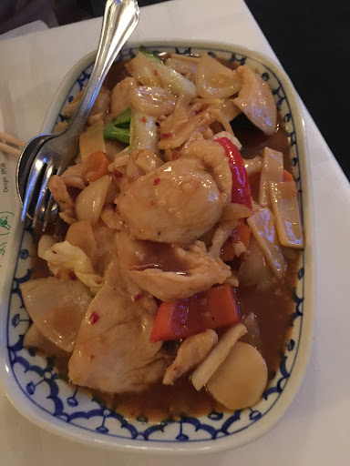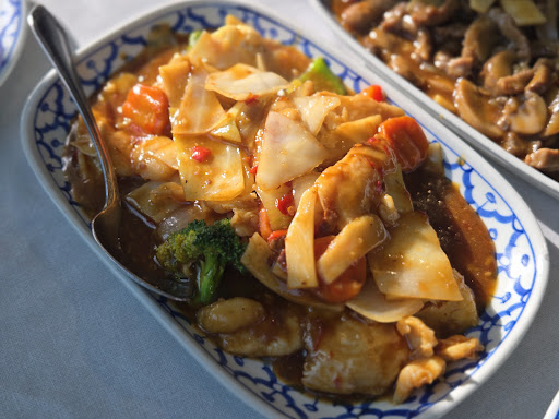 Jag åt general kyckling, som var helt fantastisk! Sötsur sås och ananas med kyckling som var saftig och god! Min man åt biff och tyckte den var mör. Vår dotter slurpade i sig kycklingsoppa utan problem. Så allt var toppen i matväg.