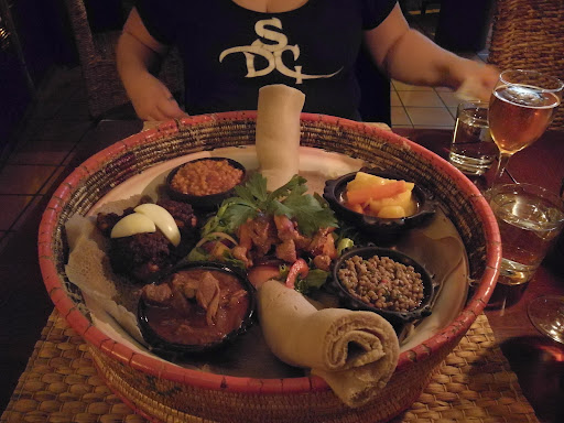 I ask myself whether it's fair to review something without a frame of reference? I've only ever dined at an Ethiopian place once before. I didn't particularly like it back then, I'm sorry to say, and I feel the same today. But I'm sure it's not the fault of the chefs in these two places, but my taste buds. I had the Sega wett, which is a beef stew in red wine with berbere which is a chili based spice mixture. At first I was fooled by the big basket in which all the food was served, but I came hungry and I left the restaurant hungry, because of the small serving, and no one asked me if everything was to my satisfaction. But the place seemed fully occupied so I guess people come for the food. The service was friendly albeit a bit inconsistent and after we'd finished our deserts it took at least 30 minutes before a waiter came to our table to ask if we wanted anything else or the check, or so we thought.. Someone came.. and picked up an empty beer bottle and then left.. We got sick of waiting and paid at the bar. Others did as well, so I'm assuming you're supposed to, but I'm thinking someone could've informed us of that and saved us 30 mins of being annoyed. The place is cosy and inviting. I liked that the menu had little tidbits about Ethiopia printed at the bottom of each page. Last but not least; try the banana and coconut pie. It's pretty awesome. I feel bad giving this place only 3 stars. I'm sure it's 4 stars, but the food doesn't appeal to me personally. I pass the torch to someone else to write a more...