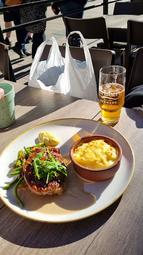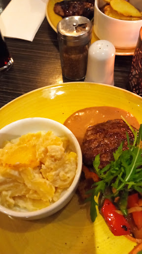 Menue is short and simple. The basics are there. Keep it simple sort of thing. This afternoon I decided to get the daily special. Oxfile med potatisgratäng, rotsaker och pepparsås. Potatisgratäng was unseasoned and dry. The veggies on the plate were bell pepper, some grean beans and one small piece of broccoli. Not rotsaker. Pepparsås was nice. But there was not a lot of it. When ordering the waitress did not ask how I preferred my meat. And when it finally arrived it was well done and a bit dry. My biggest hangup is that the portion was miniscule. The separate little bowl with the potato gratin was tiny, the piece of oxfile was small..... very small. The portion was childlike. It cost 169 kr for a tiny piece of meat, a small ramekin of potatoe and some grilled bell pepper and green beans. I felt it was not worth the money and would not...