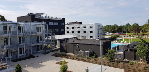 Read moreYay first time ever we got to be the first ever guest's to stay in a hotel room. This is a brand new plase so everything is pristine. It's a very contemporary hotel with a interesting look, facade made of galvanized sheetmetal. Parking is plentiful. The hotel is made up of a couple of free standing three stories buildings and a main building. The main building is where the reception is. It hosts a rooftop bar. And a bar in the main area. Rooms are quite small but just big enough to fit a little kitchenette. Bathroom is large enough nothing fancy but sufficient. Outside is a well thought out inner yard with pool bar and for those who chose a jungle gym. If that's not enough you can embarrass yourself with a tour on the mini golf court. All in good fun. There is a small place to make a fire and have a BBQ, brand new and never used. Breakfast is great. Only thing to complain about so far is the choice of furniture in the breakfast dinning area. They are loud. The kind that make a loud noise when you pull out a...
