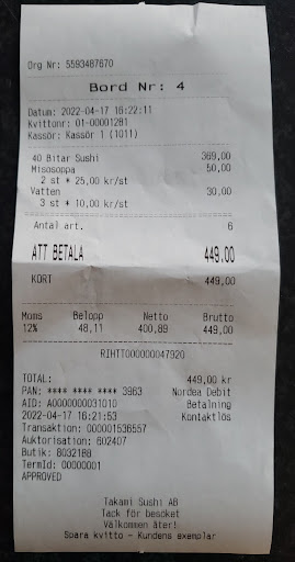 Read moreLite stressade i julhandeln slank min fru och jag in på Takami tisdagskvällen 19 dec. eftersom restaurangen var tom så när som på ett enda par, så vi tänkte att här skulle vi snabbt kunna få något att äta! Servitrisen tog vår beställning vid bordet och försedde oss snabbt med den dryck vi valt. Därefter hände inte mycket. Servitrisen svarade i telefon en eller två gånger, så vi förstod att köket antagligen hanterade takeaway-beställningar också, och att vi kunde behöva vänta en stund på vår beställning. Min fru och jag satt vid bordet och pratade, men växlade också flera gånger blickar med servitrisen som stod borta vid disken, medan vi började bli förundrade över hur långt tid vår beställning verkade ta. Det andra paret hade lämnat restaurangen och vi var alltså de enda två gästerna i en annars helt tom restaurang. Servitrisen och vi tittade förstrött på varandra, inget hände och tiden gick. Efter en halvtimmes väntan reste vi oss och gick fram till servitrisen vid disken. ”Hur lång tid till ska vi behöva vänta? Restaurangen var nästan tom när vi beställde, vi trodde att det skulle gå ganska fort.” Servitrisen tittade då i monitorn och insåg att hon glömt att en halvtimme tidigare lägga ordern till köket i datorn. ”Men jag kan lägga ordern nu, det tar bara fem minuter för köket att göra er order klar. Jag beklagar, det var ett misstag.” Under en halvtimmes tid hade alltså servitrisen stått och tittat på oss i sin tomma restaurang utan att reagera på att ingen mat kom till vårt bord. En mer oengagerad servitris än kvinnan på Takami inte möjligt att tänka sig. Vi reste oss upp och gick. Aldrig...