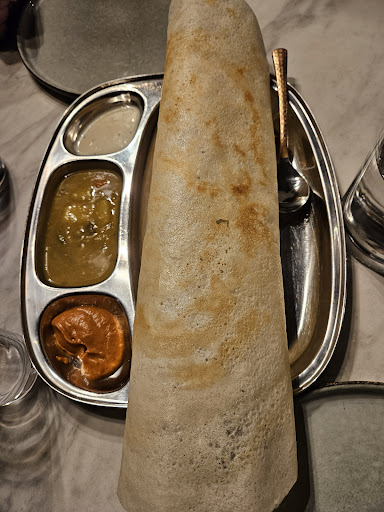 The dosa had a nice texture, but the filling tasted more like plain mashed potatoes than a traditional spiced potato masala. The parotta, sadly, tasted old, like it had been refried instead of freshly made. It was tough, very greasy, and lacked flavor.