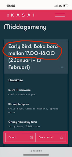 So when booking a table at 17:00 o'clock DO NOT go to the obvious "Middag" (dinner) section but scroll down until you find the conveniently hidden Early Bird menu.