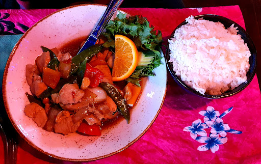 Gal Met Mamoang som bestÄr av fina tunna kyckling bitar med perfekt wokad paprika toppad med cashewnötter. För den som gillar extra sÄsiga grytor Àr denna perfekt, kycklingen och woken drunknar i sötsur soya sÄs. Till detta fÄr du perfekt tillagad ris, lÄnga vita korn och du fÄr detta i en separat skÄl vilket jag tyckte var bra.