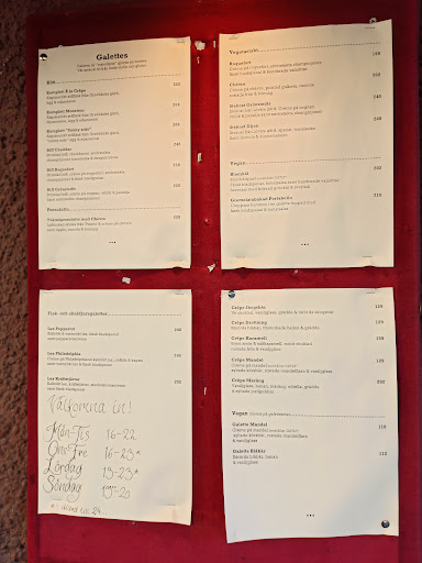 Read moreCrêperie dans Sodermalm. Quelques tables à l'extérieur et une quinzaine de tables à l'intérieur. Cadre sympa avec de la musique mais pas très lumineux à l'intérieur. Les crêpes sont plutôt chères mais ça vaut vraiment le coup. Environ 200SEK et maximum 248SEK la galette salé. Les galettes sont très bien présentées et copieuses. Beaucoup de choix differents en galettes végétariennes et véganes. Associations de goût plutôt originales et de bons assaisonnements J'avais envie de tester une galette sucré en dessert mais malgré que je suis bonne mangeuse, j'étais rassasiée. C'est ouvert tout l'après midi donc pour un goûter je reviendrai ! Cidre très bon également, environ 100SEK le verre. J'ai beaucoup aimé le cidre non filtré qui avait du goût prononcé et peu sucré. Le serveur était réactif et agréable, on a été...