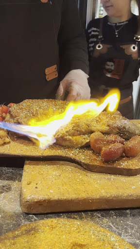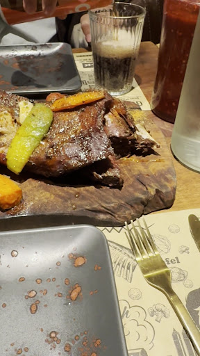 Let's talk about the food, if there is something to save it is the food, and it is good since you go to a restaurant to eat. It really wasn't bad, BUT the food brings up another issue... there is no menu, there are no options, they bring you as a garnish a bowl of stale rice, a parsley sauce, a kind of rather poor coleslaw and some "nachos"... everything is ok, let's give a 2/10 to the garnishes, but now let's talk about the meat! How do you ask for it? Well, they tell you to go downstairs and ask for the grams you want and if you want, record a video (in our case we didn't), because yes, the site offers a show and what they are looking for a bit is the show. Once you get downstairs, our friend Adam, well portrayed in all parts of the restaurant as if he were a Salt Bae-style star, asks you "how many are you" and "do you want beef or lamb" and that's where the magic begins, it opens again the smoker and takes out a piece of meat that he thinks is convenient, he removes the aluminum foil wrapping and prepares to hit it against the board so that the meat leaves the bone while explaining that if you like meat that's good, you want meat coming loose from the bone! The piece in question was a beef shank, it is an economical cut of the animal but cooked for a long time it comes out very tender, and in the smoking process it looks good, let's give it a 7/10, season it a little with a mixture of spices that he has in a bowl in front of his board, he adds roasted garlic, a roasted chili and more parsley sauce. We decided to also order some lamb to try another type of cut, and our good friend Adam, once again opened the smoker door and in this case took out 2 small pieces that were (drumroll) exact! Shanks too! But in this case of lamb, of course, they are not very noble or traditional cuts when it comes to a smokehouse, but they are much more used in the East, and the restaurant seems like a mix of both. In this case the shanks had a little more flavor, but nothing special either, let's give it a 7/10. It must be said that for 3 people, 1 shank of beef and 2 of lamb can be a lot of food, especially if it is smoked since it is much more satisfying, but we barely leave less than 100 grams of meat in total (I am a good eater).