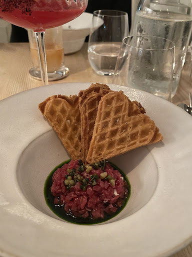 4.5-star flavors, 3 star portions. Me and my partner took 3 snacks, 2 starters, 3 main dishes and 2 drinks to get full. As for the flavors, in general it is an outstanding place with creativity, but there are still some parts that can be improved. Highlights: *The plates were very warm when served warm dishes. *The beef tartar was creamy and the waffles were crispy, the texture combo is a delight on the teeth. The ramsons and capers combined perfectly with the fresh cheese, and the aroma pleasantly mixed together with the butter from the waffles. *The oyster is a must try. The seasonings were not strong ans they have preserved the original flavor of the oysters. *The honey lavender butter with the warm bread can be used as a dessert if you don’t want too sweet stuff. Things that can be improved: *The duck meat’s original scents were totally removed, you can barely taste the duck in the dish. Plus the purée served on the side was too greasy and salty, I mistakenly thought it was chilly mayonnaise. *The cocktails were plain in flavors even though we could feel the bartender put a lot of efforts in...