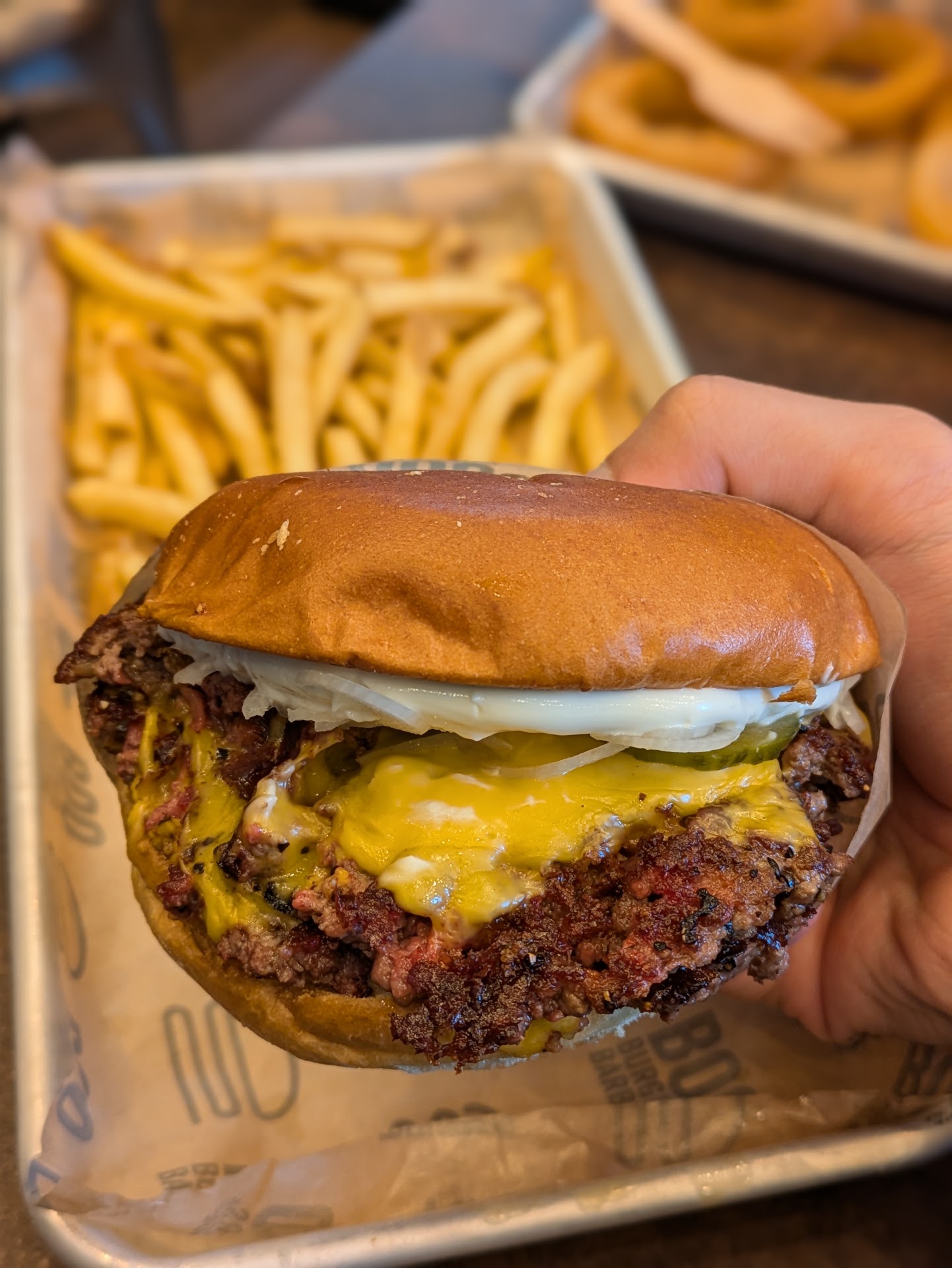 The patty is prepared in the style of an authentic smash burger, with the perfect crispiness and seasoned simply with a touch of salt and pepper.
