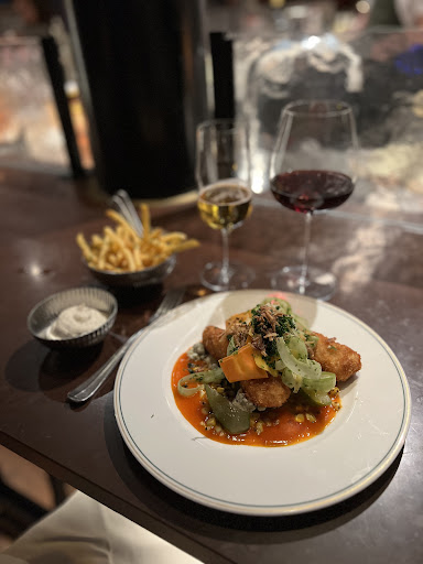 PS: the only reason the food was not a 5. I had Chick & Chips before several times (itās a classic on the menu), and this time there was two things that could improve from previous iterations. 1) the orange Astoria hot sauce was more diluted this time and not as sticky, concentrated and spicy as usual which I prefer. The old one just had more flavor! 2) Only one of the three thinly sliced vegetables had a slight pickle on it (the yellow one), the celeriac and the carrot was very mild. Together with the sweet sauce and the fatty Fourme dāAmbert cheese and deep fried chicken, they could...