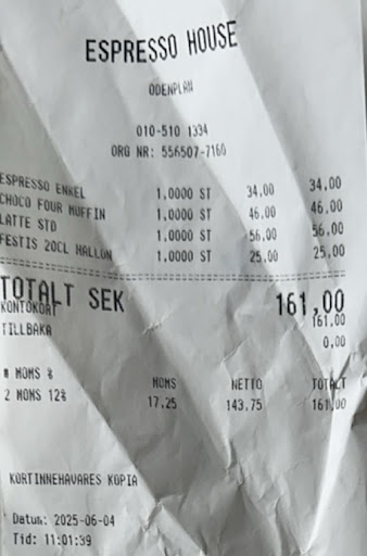Read moreAs a Greek, and a coffee lover,I found Espresso House to be a mixed experience. The snacks are delicious and the sandwiches are especially noteworthy, making them a great choice for a quick bite. However, the coffee did not live up to my expectations. The cappuccino was quite watery and lacked the robust flavor I am accustomed to. This might be just a personal preference, as others might find the coffee more to their liking.