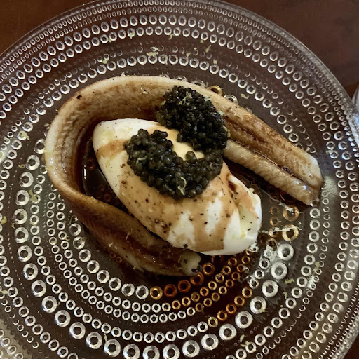 Østersene er deilige med en touch av den gode marinaden leche de tigre (som ikke blir forklart), og den første retten byr på overraskende smakskombinasjoner: (bærekraftig farmet) ål med mascarpone og kaviar. En morsom match, der en ost vi gjerne forbinder med desserter, avstemmer og løfter sødmen i det glaserte fiskekjøttet. Men hvorfor forteller ikke servitøren oss hva slags kaviar det er? Vi har allerede spurt ham om hvor østersene kom fra (Bretagne, men han måtte på kjøkkenet for å sjekke) så vi vil ikke mase på ham igjen. Han burde skjønt at vi ønsker å få vite mer om maten.