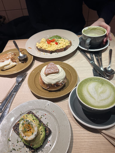 Read moreOverrated place. Crowd for take away and dine in, super loud atmosphere that you cannot hear your opponent. I loved turmeric latte, very unusual taste, great idea. Ordered pancakes and one of them has been completely burned and yet served, just burned side down. This is not good service. It’s better to bring it later and apologize but make them flawless so customer would forget even that his order came later. Awful decision…. Still cannot believe they served it burned. Was zero opportunity to complain at the place because of the crown and overload. There was no knives btw. At all. I asked personnel to check it and bring new, she answered “sorry, I have to make a coffee” 🥴 Not sure that turmeric coffee will be enough of the reason to...