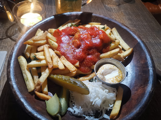 Read moreI'm not sure why they'd just take over the Google listing of the restaurant that was here previously and then don't even bother to update the images and a lot of the info, but okay, I'm not here to fix their marketing, but to eat. Just know that what you're looking at isn't how things look in reality. I came here with my son, who loves currywurst and I was happy to see that the vegan burger on the menu on their website had been replaced with a vegan currywurst. There still aren't more vegan options, but I love a good currywurst, so that's okay with me. The portion was nicely presented and very big. I thought there could have been more sausage and less fries, but no matter. I liked the pickles and the kraut, too. Perhaps not super authentic, but tasty. There are only 2 places in Stockholm that offer vegan currywurst. The sausage in the other one is better, but the portion size and...