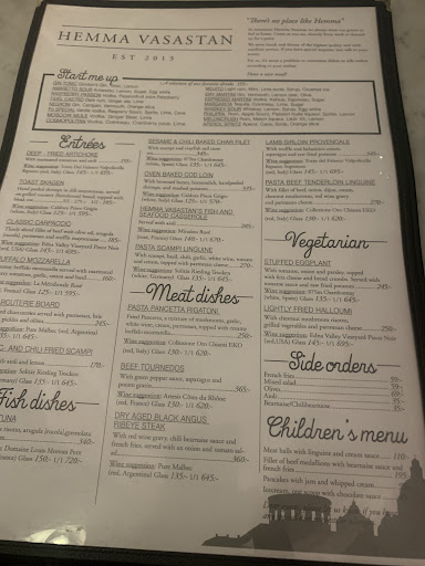 Maybe it was a good thing we didn't call ahead to see if there were available tables at That Other Restaurant recommended by the hotel staff. Had we checked, we wouldn't have walked the half mile, uphill, before we started searching and calling for a restaurant that could accommodate a party of four. We started calling restaurants with solid reviews, and after finding several with no table, Restaurang Hemma Vasastan was the first to offer us a table. What good fortune! We received a warm greeting when we arrived, and seated at a comfortable table in the back of the restaurant. The waiter was both skilled and friendly. He guided us through a menu that is filled with tempting dishes, that all beautifully demonstrated a creative approach to traditional favorites. One of the things I like in a waiter is when he can guide you through the menu; it demonstrates that he has eaten the food and knows the relative strengths of each dish. (Oh, how I hate waitstaff who tells you that everything is good and offer no guidance.) Which fish is good? The broiled (seared) tuna is exceptional. (He was right.) We continued to narrow down the choices in the style of a good optometrist comparing two options (would we like A or B) and the dinners we chose were all superb. The Dry Aged Black Angus Ribeye Steak was an excellent piece of meat, perfectly cooked, tender, juicy, with a red wine gravy. The Pasta Beef Tenderloin Linguine was a joyous combination of ingredients surrounding the beef and linguine. Similarly, the Lightly Fried Halloumi was a squeaky cheesy delight. The four of us shared two Chocolate Fondants with Vanilla Ice Cream, a hot, gooey, chocolate melt offset by the ice cream served on the side. Prices were very reasonable. Service was friendly and professional. The food was uniformly excellent. We were happy when we left Restaurang Hemma Vasastan. If we lived within an hour of Stockholm. we would be regular customers. Don't miss out on this...