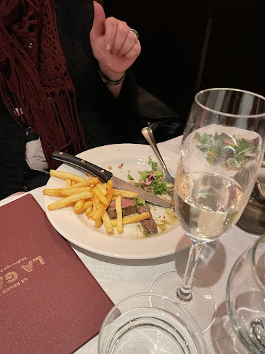 Maten i sig var ok. Eller, köttet var helt ok, vinet (om Àn lite smÄ glas - fula dessutom) var helt ok. NÄgon som kan vin hade sÀkert haft invÀndningar. Salladen var Àtlig, om Àn drÀnkt i nÄgon slags senapsdressing och brödet var Willys billigaste baguette. Pommes var en sorglig historia som ligger i nivÄn under McDonalds. Lite sladdrig, lite osaltad och undermÄligt friterad. Men ÀndÄ. Jag hade druckit vin, jag var hungrig, det tog slut. Hungern Àr trots allt den bÀsta kryddan. DÀr och dÄ tÀnkte jag att jag fÄr tÄla.