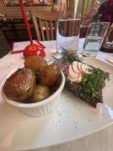 From the inside Östermalms Saluhall, Nybroe Smörrebröd is an unassuming place packed with a lot of flavor! The open faced pickled herring sandwich (Smörrebröd) was topped with the tiniest cut chive toonds, whipped butter, diced red onions, dill, and fresh radish slices. It was a work of art! The pickled herring was so good too. And, the side of potatoes were perfectly buttery and a bit crispy on the outside and soft and warm on the inside. It really was the perfect little meal (or snack, depending on how hungry you are). The music was a bit loud and the staff/waitress didn’t seem super interested in making small talk, but they were...