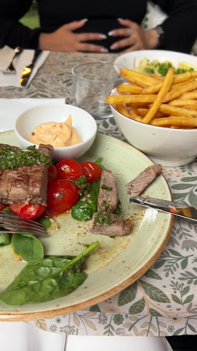 Ryggbiff var jÀttegott med pommes frites, lite kapris, ruccola, smÄ tomater, men det skulle vara gott med lite broccoli kokt, samt att köttet var jÀttegott grillat, men tycker att det borde serveras lite varmare, köttet var lite kallt nÀr den serverades pÄ bordet.