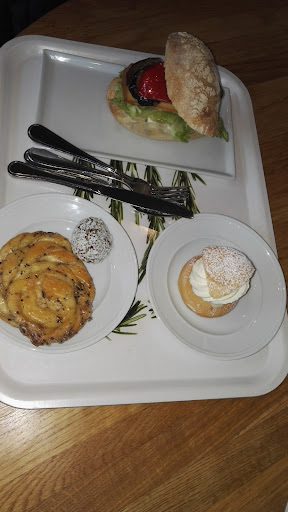 (2019-04-16) Tillägg: Vid våra tidigare besök har jag tagit en kaffe, men nu ville jag ha en te. I skillnad mot andra kaféer så är teutbudet här mycket magert; du får välja på färdigbryggt svart eller grönt te. Vill man ha en annan sort är man tvungen att göra en beställning någon dag i förväg, och beställningen måste vara på minst 4 ... canapéer eller tekannor eller vad man nu [kan] beställa; har man tur har någon annan redan gjort en beställning och man kan hänga på den. Med tanke på hur enkelt det är att ställa fram några burkar med löste eller en ask med olika påsteer framstår det valda arrangemanget som mycket märkligt.