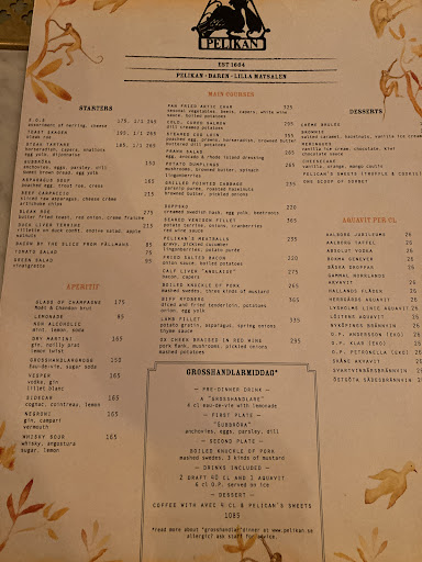 Read moreI was a little hesitant before visiting the restaurant because of the abundance of praising reviews that sounded somewhat unnatural to me. However, after having dinner at Pelikan, I can easily call our experience remarkable. We walked in on Monday evening. The restaurant was full (which was already a good sign), filled with a sound mix of tourists and locals alike. We were offered to wait for 40 minutes, which was fine with us. The setting was very traditional, with a comfortable blend of upscale and cozy. The service during our visit was very warm and attentive. We were a company of three people, therefore, we ordered three of their staple courses to share: meatballs, potato dumplings, and stewed ox cheek. Actually, we did that only out of curiosity, with no high expectations, because we are really familiar with these simple meals (at least close variations of the meatballs and potato dumplings) as they are very typical of our native Lithuanian cuisine. Yet again, it proved that the simpler the dish, the greater the mastery needed to make it perfect. All meals were perfectly balanced and simply delicious (maybe the ox cheek might have been a little softer, or am I just too picky). Considering the price range in Stockholm, I'd say prices at Pelikan are very reasonable. Overall experience...