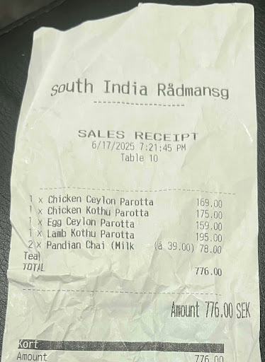 First Order: We ordered Mysore Masala Dosa and Lamb Sukka. While the dishes were pricey, we were hopeful about the quality. However, the sambar was downright ridiculousāfar from authentic and lacked any resemblance to South Indian flavors. We thought perhaps the authentic taste was compromised here in Sweden and decided to give it another try.