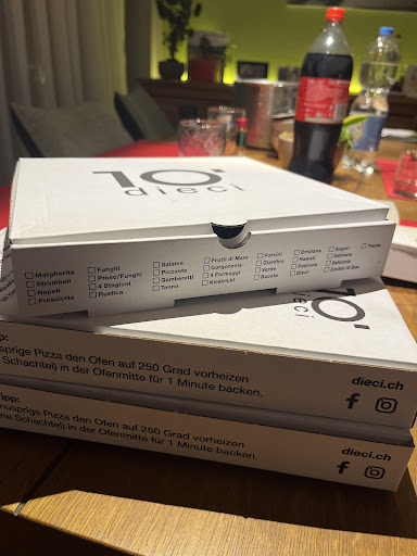 Alles in allem bin ich überaus zufrieden mit meiner Erfahrung bei der Pizzeria Dieci. Die freundliche Atmosphäre während der Bestellung, das erfreuliche Abholerlebnis und die Aufmerksamkeit für meine speziellen Wünsche machen sie zu meiner bevorzugten Wahl. Ich freue mich bereits darauf, meine nächste Bestellung aufzugeben! gruss...