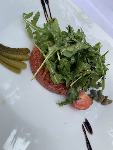 Read moreDie Reservation ging über lunchgate. Für eine Ergänzung habe ich den publizierten Mailkontakt angeschrieben und zweimal angefragt, dues blieb unbeantwortet und am gleichen Tag musste ich anrufen, das war sehr ärgerlich und kostet 2 Punkte. Wir sassen auf der Terrasse, das Gedeck (Gläser & Besteck) war wohl den ganzen Tag auf dem Tisch, da es von den Bäumen schmutzig wurde, auch das ist ein Punktabzug, weil es unappetitlich und unüberlegt ist (wir haben es dann selber poliert, obwohl sie es gesehen haben, taten sie nichts dergleichen und fragten nicht nach, warum wir polieren). Der Service war okey, könnte jedoch mehr Augenkontakt und Leidenschaft aufbringen. Das Essen war im Grossen gut. Das Rindstatar scharf war sehr gut gewürzt und die dazugehörige Knoblibrötli auch (weniger Öl wäre besser). Der grüner Salat war gut gemeint, eine sehr grosse Portion. Das Entrecote war köstlich, die Pommes ungesalzen, dafür die Kräutetsauce sehr gewürzt. Das Schweinesteak war etwas zu trocken, zu lange in der Bratpfanne, wollte deshalb mehr Morchelsauce verlangen, weil dort sehr gespart wurde, nur war kein Service erreichbar. Die Desserts waren gut.