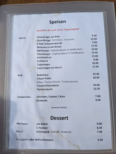 Das menu ist abwechslungsreich (von Burger bis Weisswurst) und sollte für jeden etwas dabei haben.