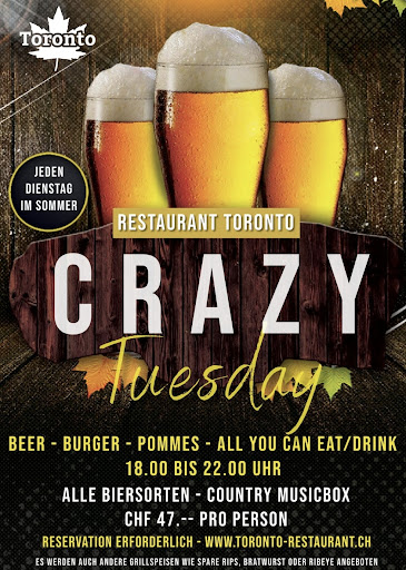 Read moreWir waren am Dienstag im Toronto. Da gibt es im Juli und August Burger, Pommes, Bier so viel man möchte und kann für 47 Franken pro Person. Das Burgerfleisch ist eine sehr gute Qualität. Dazu gibt es entweder eine pikante Sauce oder eine rauchige Sauce. Zu den Pommes gibt es eine sehr leckere Knoblauchsauce. Auf der Bierkarte hat man eine grosse Auswahl an kanadische Biere. Die Bedienung ist freundlich und der Chef Reinhard Kocher ist sehr zuvorkommend. Ich habe auch schon paar Mal an der Weinmesse im Bern Wein bei Ihm bezogen. Ich persönlich finde das Preis-Leistungsverhältnis sehr gut. Ich werde sicher wieder kommen....