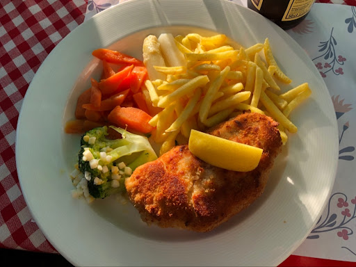 Zum Essen es war durchschnittlich. Meine Frau hatte Zanderfilet im Backteig (schlabrig) und ich Cordon bleu als Fitnessteller unsere Tochter einen gemischten Salat mit Pommes Frites. Es war OK.