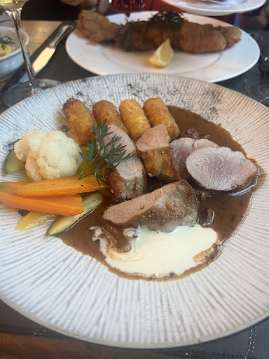Zum Start gab es knackig-frische Salate, dazu einen ausgezeichneten österreichischen Wein, der perfekt zu den Speisen passte. Bei den Hauptgängen waren wir uns einig: Das Wiener Schnitzel war goldbraun und zart, das Wiener Backfleisch saftig und aromatisch, und das Schweinefilet auf den Punkt gegart – alles top zubereitet und schön serviert.