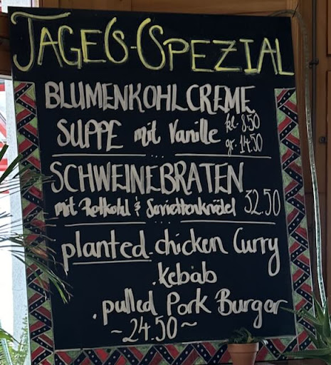 Wertes Restaurant, schreibt doch bitte alles damit an, was ihr dann auch liefert. Heute einfach Chicken und Pork weglassen, da beides nicht drin war. Es soll (für ein anderes Mal) auch nicht Schnitzel oder sonst was heissen, pflanzliche Gerichte sollen eigene Begrifflichkeiten haben. Hier hätte das dann einfach «planted curry Kebab pulled Burger» geheissen. Hätte mindestens so perfekt gepasst.