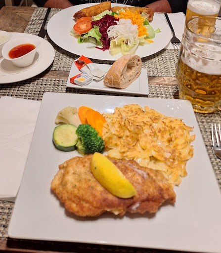 what a pleasant surprise! I booked hotel Bellevue not knowing it had such a good restaurant in it as well! it was full on a Wednesday night. great ambiance, pleasant staff, and the food was really really good. I always love to try the seasonal specialties. starting with the pumpkin soup with a great taste and good layer of cream on top. then I had pieces of baked dear-meat, very tender, well seasoned in a great wild sauce. with spatzli red cabbage and a peer with berry compote. followed by my favorite, apfelstrudel with vanilla sauce and ice-cream. all fresh!!...