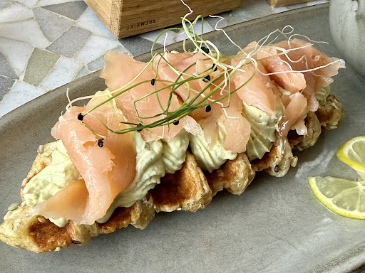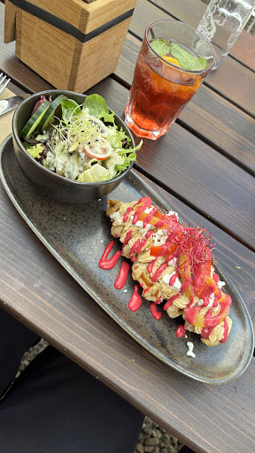 I ordered a Purple Veg Croffle and a homemade ice tea. The Croffle had Hummus & Feta on top with a sprinkle of beetroot. It was very delicious, I‘d order it again! I definitely recommend it - even the dough was very interesting, as it consists of a mixture of waffle and croissant. It‘s a bit lighter than your typical waffle dough.