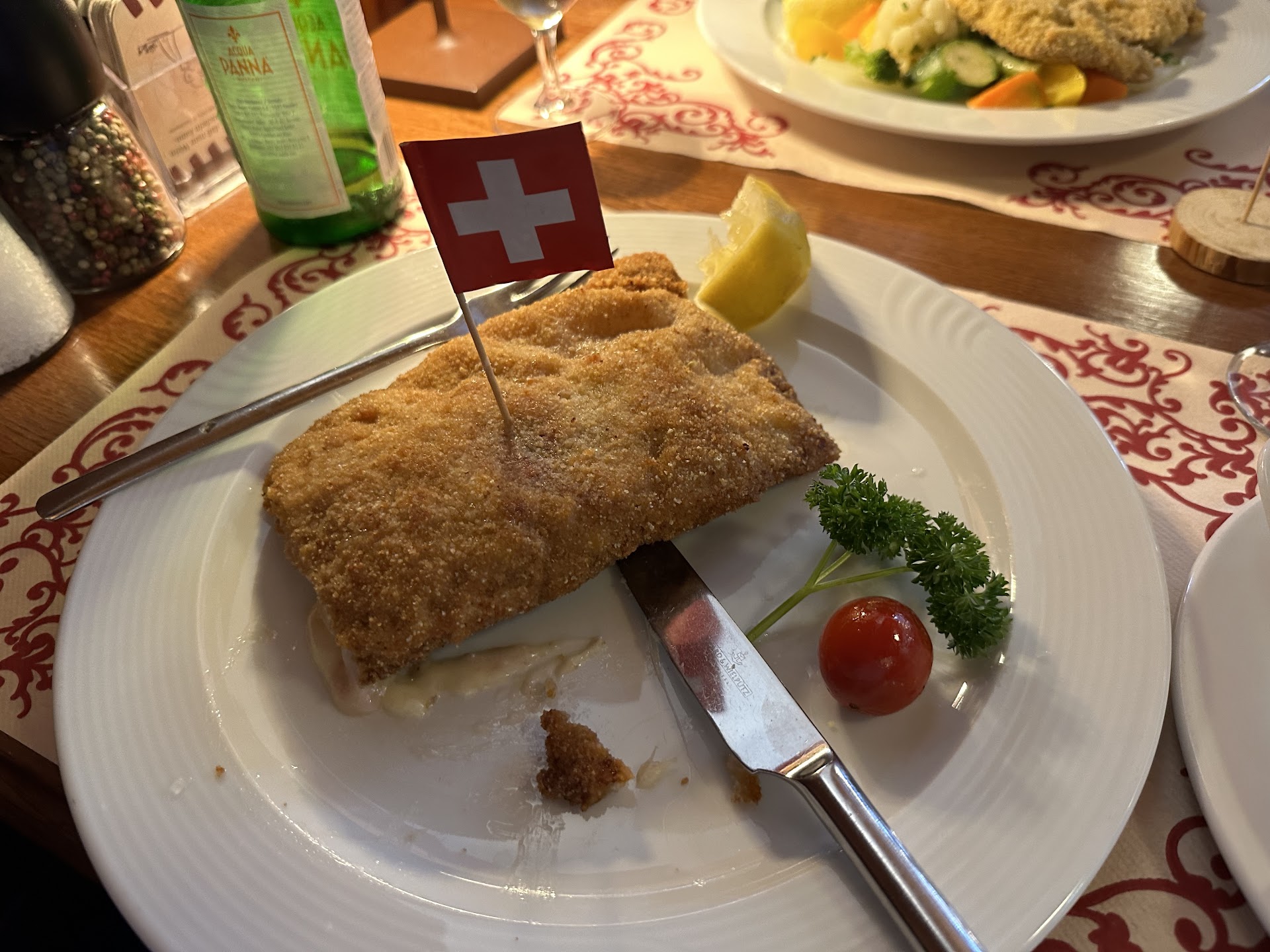 We were delighted to see a significant number of gluten-free options available for my wife who thoroughly enjoyed the weinerschnitzel. The schnitzel was tender and flavorful. My veal cordon bleu was excellent and prepared with a generous amount of cheese. Both of our dishes were very large in their size. I also had traditional Swiss rösti (hash browns) which were crispy on the outside and soft on the inside. This is an excellent place to eat local cuisine and feel immersed into the...