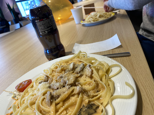 The children enjoy spaghetti, sausages, beverages and pieces of cake or ice cream. Fair pricing. Food quality way better than in many other countries. Obviously not nouvelle cuisine. But if your kids are hungry they get a decent lunch here. And it is super convenient after shopping in Migros Supermarket (MMM) and SportXXX or Office World. Parking available - park on the roof if crowded. Pay for parking at the machines before you go to your car. Saturday usually...