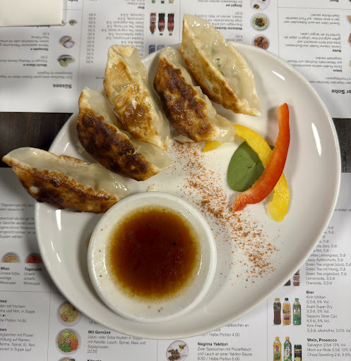 Starter & Main: I started with the Veggie Gyoza that comes in 5, deep fried, fresh and very delicious. As a main I chose the Togarashi soup (spicy Miso soup) as a base and the Chicken Ramen. That comes with Ramen Noodles, thin chicken slices, carrots, spring onions, Menma (bamboo strips), spinach leaves and an egg half. I have added on top an additional soy marinated egg half. The soup had a good spice level, the chicken slices were very juicy and the other ingredients added up well in freshness and taste. I would rate it a good and solid Ramen. If there would be something to complain, I could say, they could add a full egg (2 halves) already as a standard, but that's a minor thing and does not decrease the overall good quality. To add, they also have Udon or Soba as well as Japanese Tapas as alternative to Ramen.