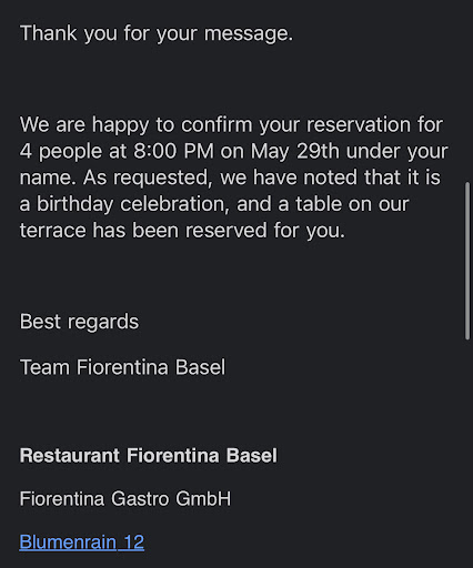 Read moreI booked a table a month in advance for a special birthday celebration and had it confirmed twice over the phone, plus received an email confirmation with the correct date and time. I made it clear that this was an important occasion—my mother-in-law’s birthday, during her visit to Basel—and wanted everything to go smoothly. The reservation was for a Thursday, not even a weekend.
