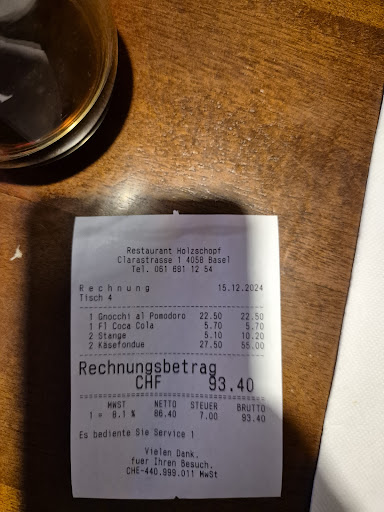 Wir waren im Zuge der Baselworld Messe in der Stadt und haben im Restaurant Holzschopf gegessen, aber wir wurden nach Strich und Faden abgezogen. Die Kellnerin bringt uns eine Speisekarte aus dünner Pappe mit dem 'Baselworld's Menü'. Mir ist aufgefallen, dass ein anderer Tisch eine andere Karte hat. Ich habe die Kellnerin gefragt warum wir nicht die gleiche Karte haben, daraufhin meinte die Kellnerin "Das sind Spezialitäten, und die bekommen nur Einheimische". Auch mehrmaligen probieren wollte uns die Kellnerin die andere Karte nicht geben. Wir haben dennoch dort gegessen, eine Pizza Tonno und einen Berner Rösti. Bezahlt haben wir für die Pizza 21,50CHF und für den Rösti 24,50CHF. Im Internet findet man eine Karte in der die Pizza al Tonno 18,50CHF und der besagte Rösti 20,50CHF kosten.