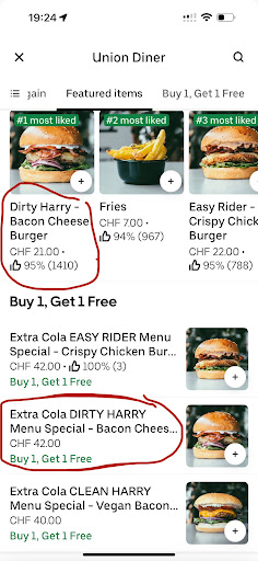 Edit for response: but this is not accurate! For example a menu would cost typically around chf30, and you often would run 2for1 deals with 2 menus or 2 burgers in the past, and it would be around 30 chf or so, which is a great deal and I have ordered many times, but this is new, you're increasing the base-price over 40chf, and hoping someone falls into the trap thinking its...