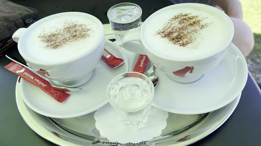 Besonders schön: Hunde sind hier ausdrücklich willkommen und werden genauso freundlich behandelt wie die zweibeinigen Gäste. Wassernapf steht bereit.