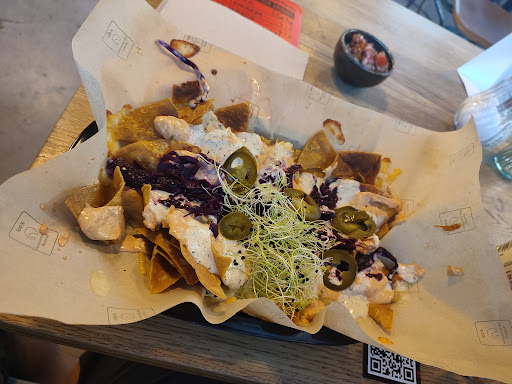 -Being a latino I love loaded nachos, but I regret to say that they do not have a meat option (it could include chicken or beef, for example). -Unlike all the other loaded nachos I've tasted in Mexico, USA, Colombia, Venezuela, geneva, they do not come with refried beans or any beans for that matter. -their pico de gallo is tiny (but the taste is almost as good as a homemade one that I used to sell in my company in Venezuela) -they use red cabbage and alfalfa, they are definitely extra. The loaded nachos would be best with the pico de gallo, cheese, jalapeños and chicken. -some nachos were burnt +taking the alfalfa and the red cabbage aside, the melted cheese jalapeño and the Chipotle mayo taste amazing. First time in Europe that the hotness of the sauce in a restaurant makes my eyes watery.