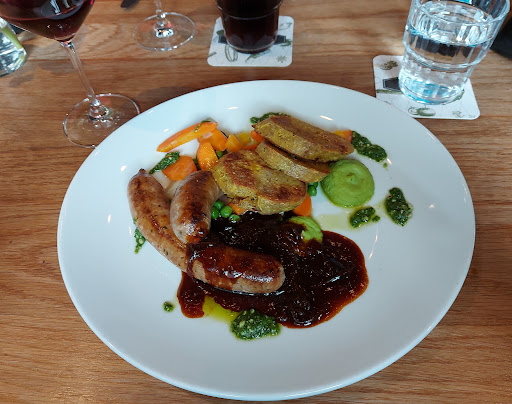 As entree, I had an aspargus soup. As main dish, I had sausages with a honey-chili sauce, bread-dumplings and vegetable. My dessert was a browney. Everything tasted really great. The portions were fair, you won't leave hungry. My friend had liver, which he also recommended.