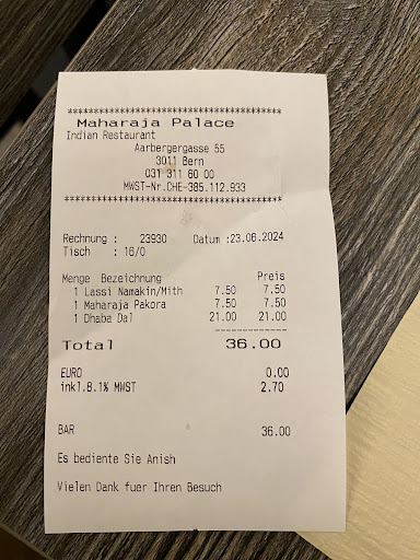 Read moreDon't go if you are an Indian or if you need authentic Indian food.lowest quality rice in the biryani which was not served with anything like curd or raita,much spicy even asked for less spicy because order was taken just by remembering them,charged 5 chf for tapwater which was chilled cold water even for small kids in winter. The guy didnt understand the difference between hot,warm,cold and normal plain water. Even that chilled water was served only after asking during the meal.should have been on the table after the order was taken.Amritsari Chole was having no taste defaming the great Amritsar and India. Even 1 star is more for them. Even the road side thelawalas in India cook and serve better. I doubt if this is even run by an Indian.Maharaja...