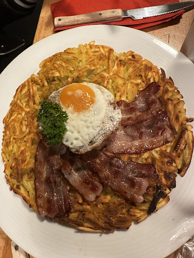 The Rösti we enjoyed tonight was a culinary masterpiece, boasting a perfect balance of crispy exterior and tender, well-seasoned potatoes within. The dish was a delightful symphony of flavors, complemented by its golden-brown perfection. Each bite offered a satisfying crunch, making it clear that the chef had mastered the art of crafting this Swiss classic.