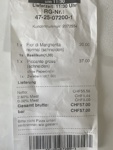 Read moreEigentlich bin ich nicht der mensch wo seine zeit für solche kommentare ausgibt, aber was ich grad vor 10min bekommen habe ist eine frechheit! Habe um 19:10 2xpizzas&1 tiramisu bestellt. um 20:20 haben wir dann anrufen zum nachfragen, weil laut app geheissen hat es dauert 45min (lieferdauer).. am telefon ist uns gegesagt worden sie haben viel zu tun dauert 20min (alles klar), es tut ihnen leid sie schicken eine gutschein mit wegen diese verspätung (wenigstens was) um 21:00 hat es erst an der tür geklinget! doch dann hat alles übertroffen wo wir die pizzas bekommen haben!! beide pizzas einfach kalt und ich übertreibe nicht, sogar tiramisu war wärmer als die pizzas.. aber danke für diese 5.- gutschein aber diese werde ich nicht mehr brauchen weil eines weiss ich, ich werde nie mehr bei...
