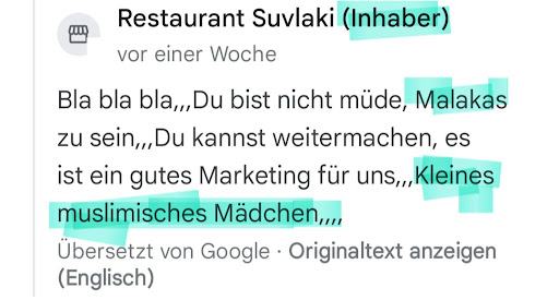 Antwort vom Inhaber vor einer Woche Bla bla bla,,,You are not tired of being malakas ,,,You can keep going it's a good marketing for us,,, (Ăbersetzt von Google) Bla bla bla,,,Du bist nicht mĂŒde, Malakas zu sein,,,Du kannst weitermachen, es ist ein gutes Marketing fĂŒr uns,,,